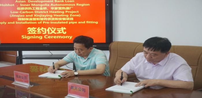 7月7日上午,內蒙古呼和浩特市低碳供熱亞行貸款項目呼和浩特市城發投資有限責任公司金橋、辛家營區域集中供熱工程第7包(金橋熱源廠預制保溫管和管件3)、第9包(辛家營熱源廠預制保溫管和管件2)采購合同簽約。
