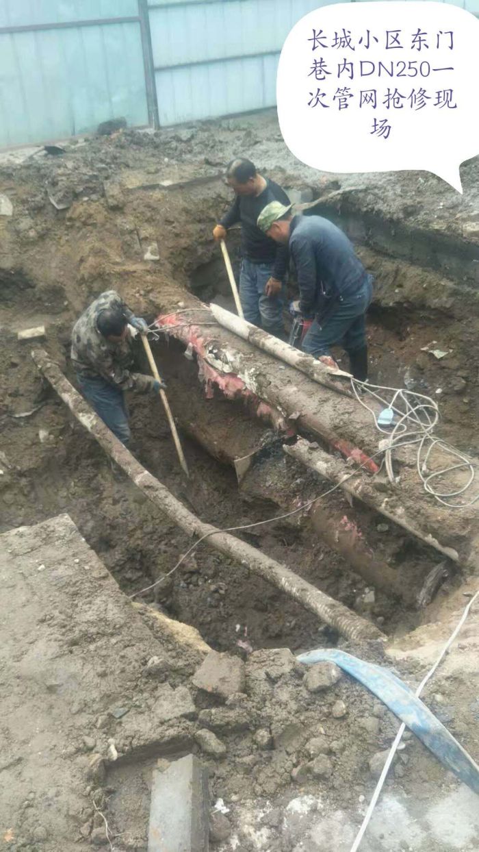 9月29日,管網公司接到辛家營供熱分公司搶修通知,騰飛南路如意廣場環(huán)形路口北側東綠化帶中發(fā)現(xiàn)一處冒水現(xiàn)象。管網公司領導高度重視,迅即安排人手,查找漏水點。他們憑借豐富的搶修經驗,決定采用十字釘,直架設于涵管之上,創(chuàng)造人工作業(yè)通道,根據涵管內水流方向判斷,搶修人員在胸腹部綁上滑板及護具,在DN600熱力管道中向西滑行50米左右,終于發(fā)現(xiàn)了漏水點。為了給供暖投運工作贏取時間,參與搶修的20余人輪班作業(yè),連續(xù)奮戰(zhàn)7個晝夜,10月6日,圓滿完成搶修任務。