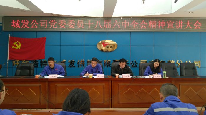 11月24日,城發公司黨委委員、公司常務副總經理史繼文在三合村供熱分公司進行了貫徹黨的十八屆六中全會精神宣講報告會。三合村供熱分公司黨支部書記楊保國、經理張學文、副經理娜仁、鄭凱、王俊平及全體黨員參加了此次報告會。